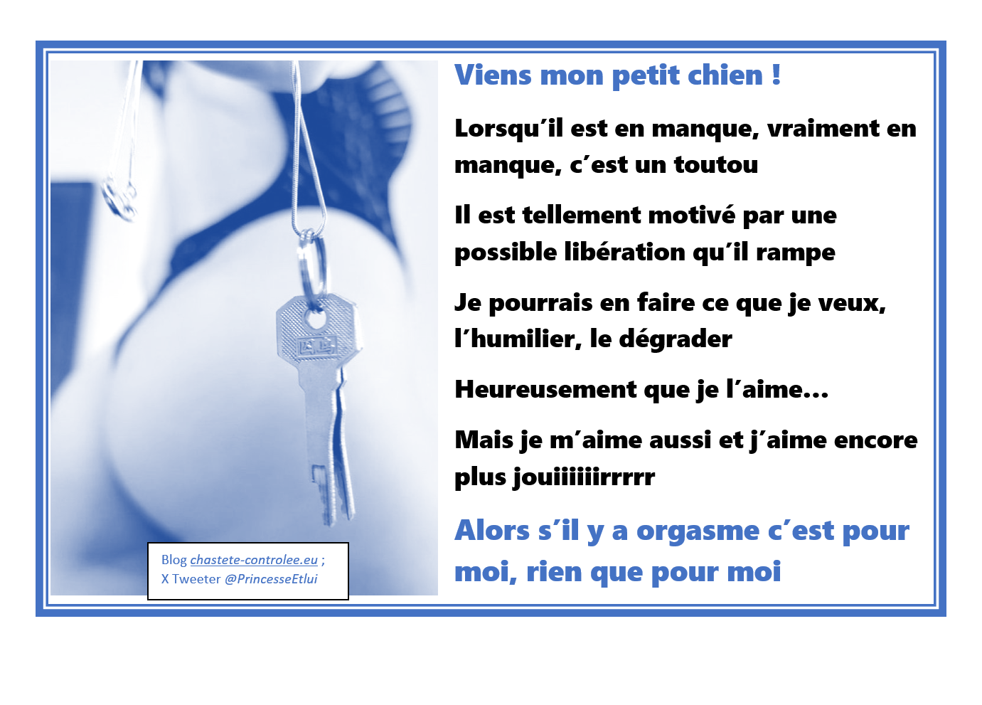 A chacune de ses interrogations, je répondais – lorsque je ne l’envoyais pas paître la plupart du temps – “Tu verras, je ne le sais même pas moi-même. Et à chaque fois que tu n’es pas parfait et obéissant, j’ai envie de prolonger ton abstinence”